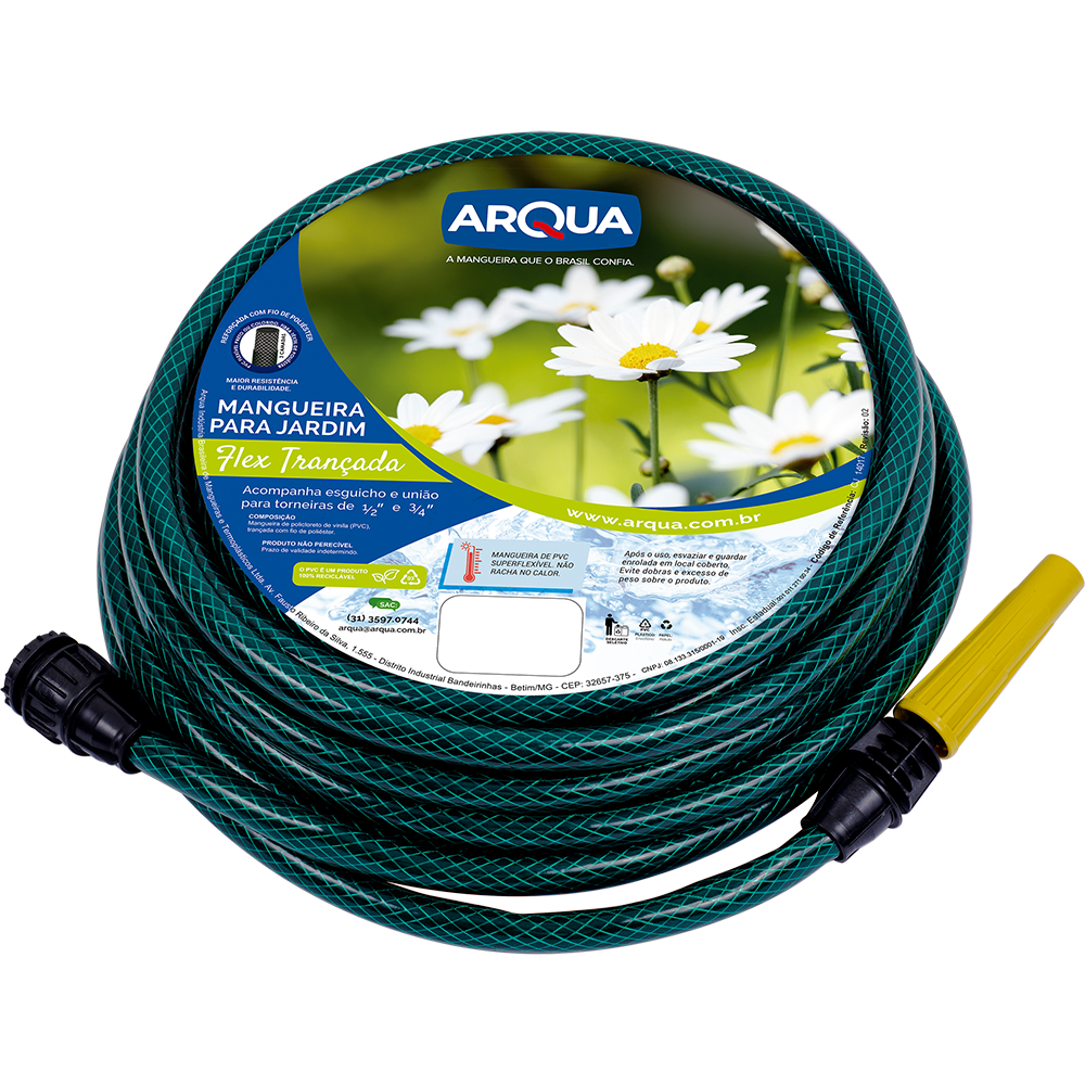 Conjunto para jardim, fabricado com mangueira de PVC flexível em três camadas: camada interna de PVC preto ou colorido, camada intermediária de fibra têxtil de poliéster e camada externa de PVC cristal colorido. Montada e embalada com esguicho e conexões especiais para torneiras de 1/2" e 3/4".