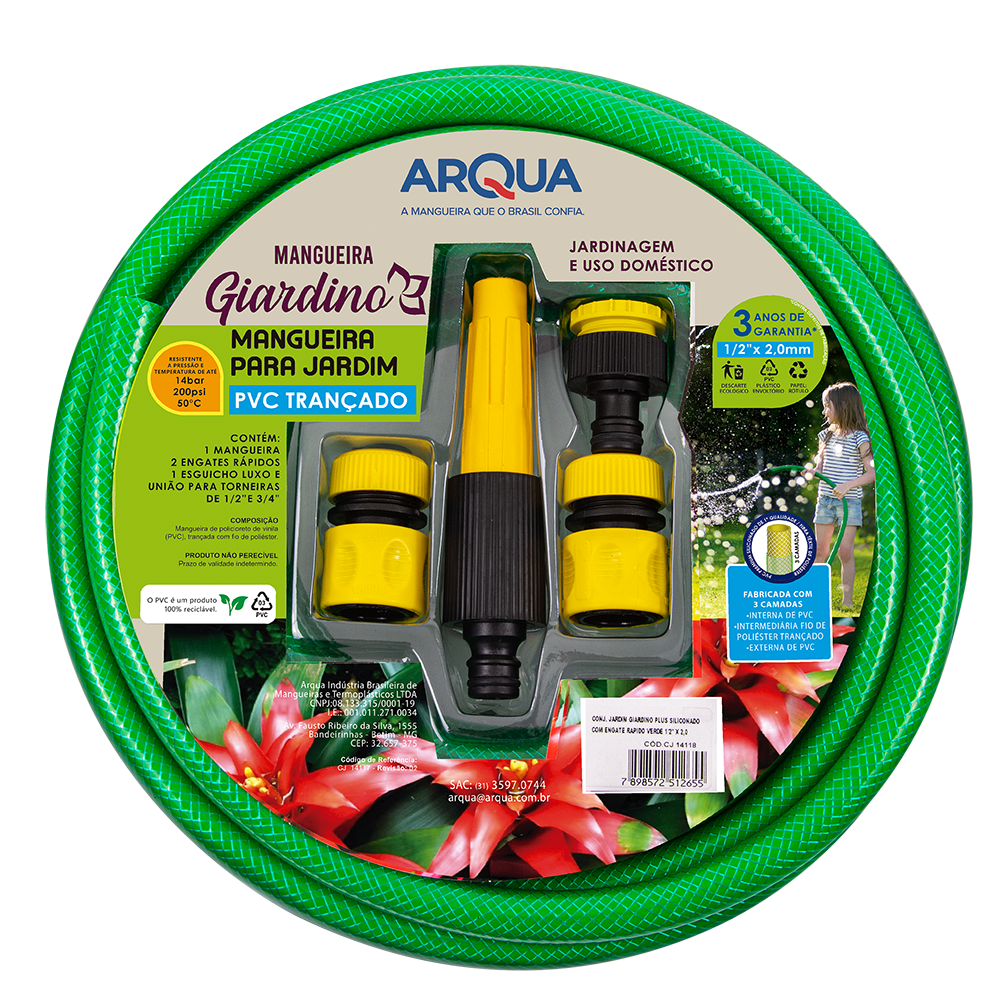 Conjunto para jardim, fabricados com mangueira de PVC cristal flexível em três camadas: duas de PVC cristal ou colorido, intercaladas por uma camada de fibra têxtil de poliéster, conferindo ao produto ótima qualidade e durabilidade quando submetido à pressões domésticas e uso contínuo. Montados e embalados com esguicho tipo “luxo”, conexões para mangueiras de 1/2" e 3/4" e engates rápidos para torneira e esguicho.
