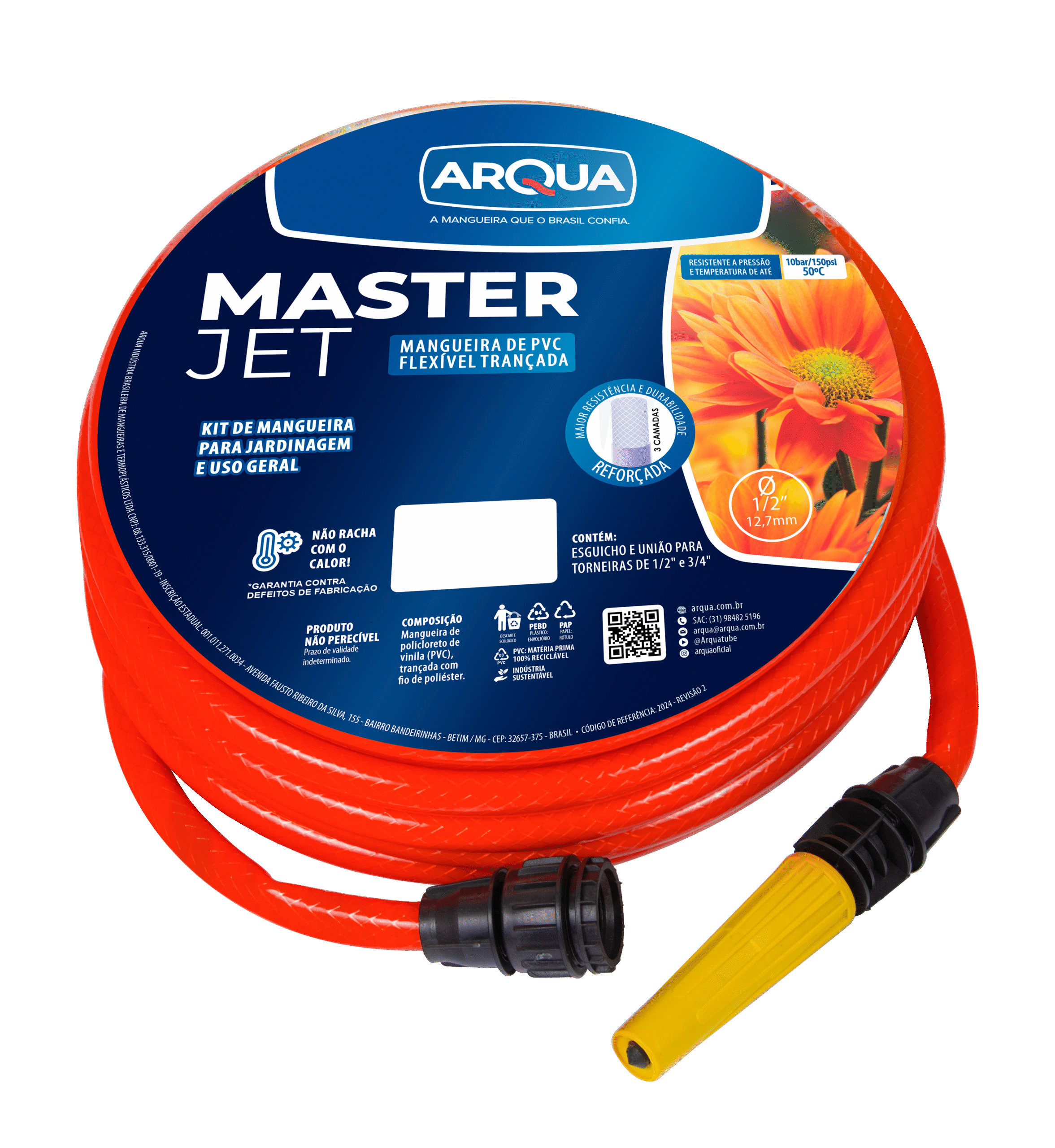Conjunto para jardim, com mangueira de PVC flexível em três camadas: camada interna de PVC preto, camada intermediária de fibra têxtil de poliéster e camada externa de PVC cristal colorido. Montado e embalado com esguicho e conexões especiais para torneiras de 1/2" e 3/4".