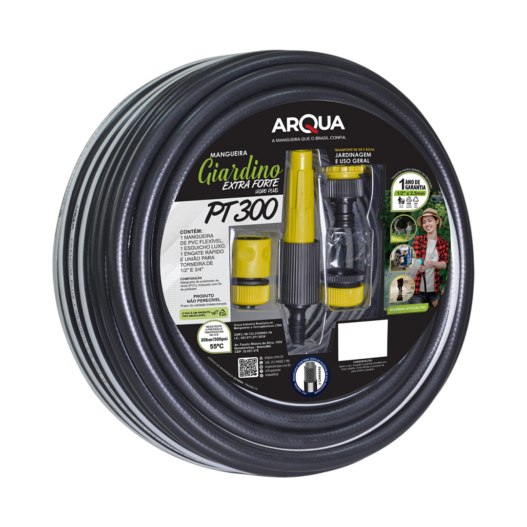 O conjunto Giardino Extra Forte PT300 é flexível, de uso profissional e doméstico, reforçado com fibra têxtil de poliéster de alta tenacidade, utilizado principalmente em jardinagem, irrigação e transporte de ar e água, acompanha engate rápido, esguicho de luxo e união para torneira de 1/2" e 3/4". Suporta pressões de trabalho de até 300lbs.
