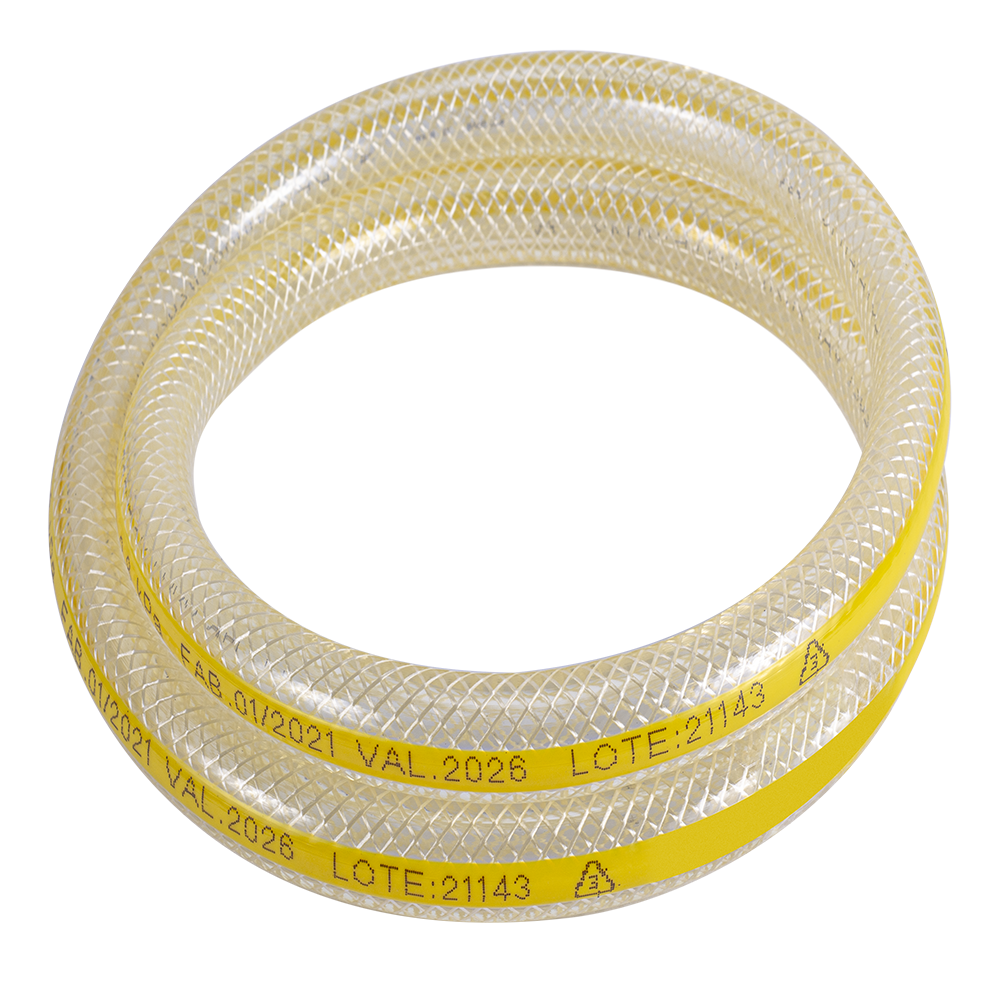Mangueira flexível, fabricada em PVC virgem cristal amarelado transparente. A mangueira de gás GLP Normatizada NBR 8613/99 Arqua é específica para tal uso e tem prazo de validade de 5 anos de uso.